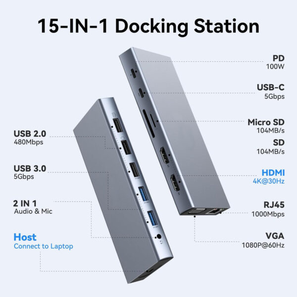 Triple Display USB-C Hub MST 15-in-1 Type C Docking Station interfaces include: